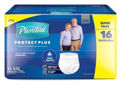 Ropa interior con protección, para las pérdidas abundantes de orina, elaborada con un gel súper absorbente para brindar la máxima absorción y protección de la línea Plenitud Active